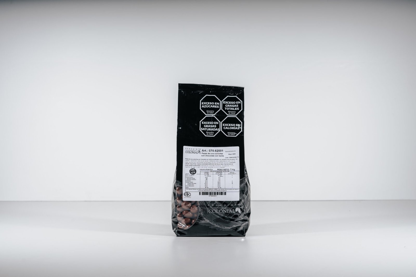Ingredientes: pasas de uva, azúcar, manteca de cacao, leche en polvo entera, masa de cacao, leche descremada en polvo, emulsionante (INS 322), ARO (vainillina).